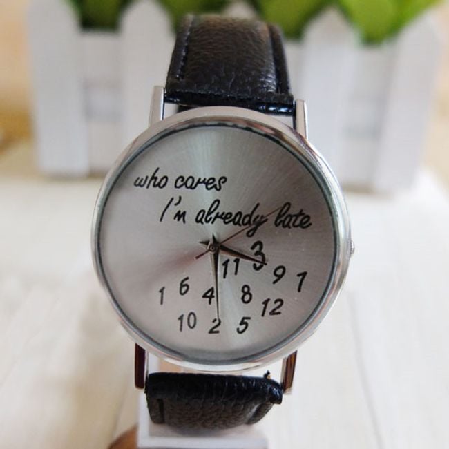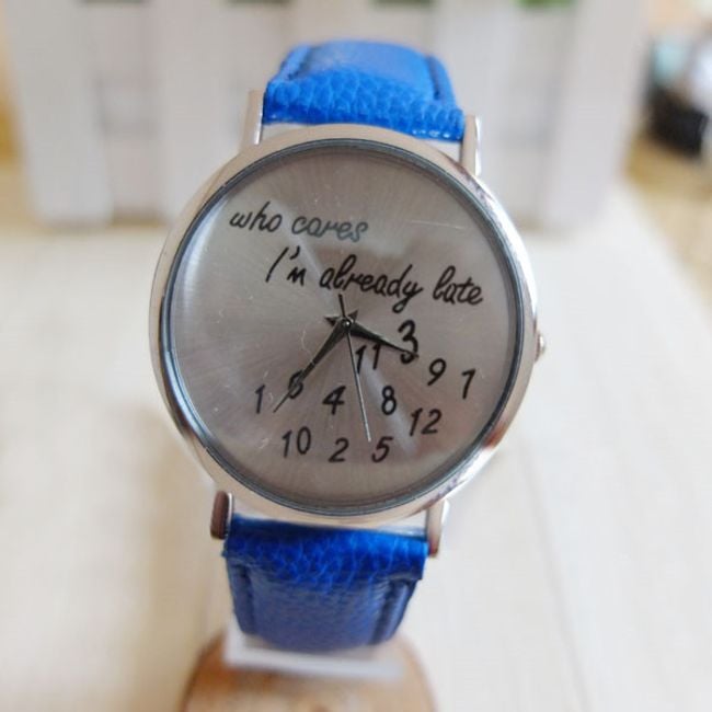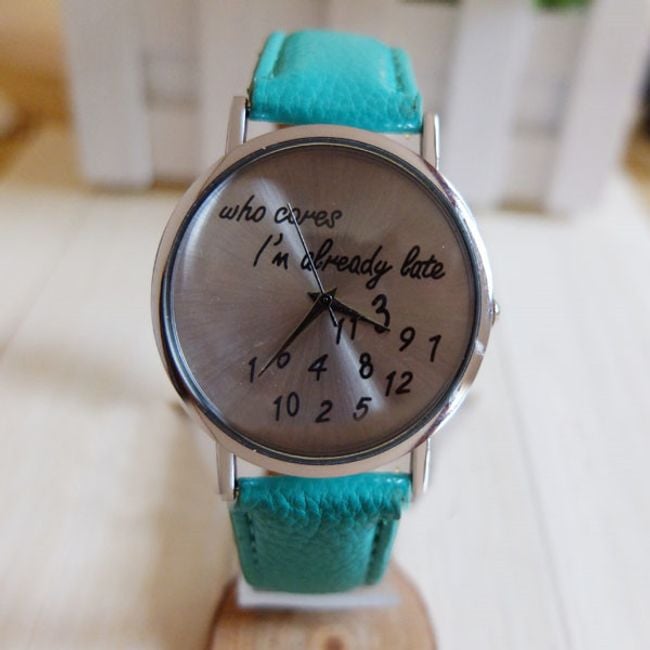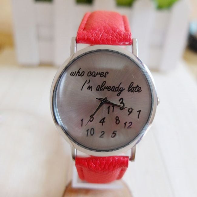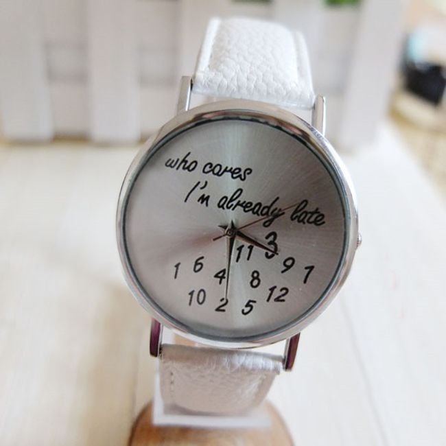 Schöne Uhr mit ungewöhnlichem Design. Auf dem Zifferblatt steht der Schriftzug „Who cares I´m already late“. Das Armband besteht aus PU-Leder. Erhältlich in 6 interessanten Farbvarianten.