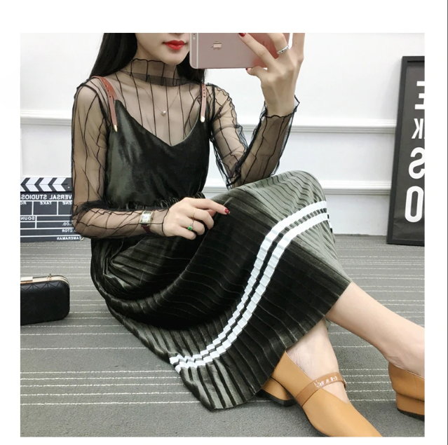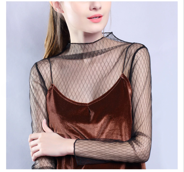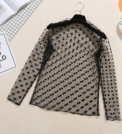Damen schwarze durchsichtige Bluse. Verschiedene Muster, lange Ärmel, niedriger Rollkragen.