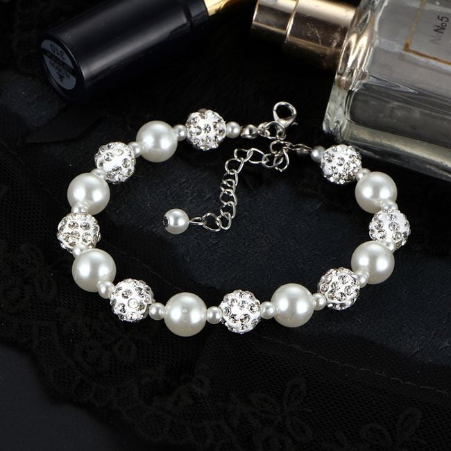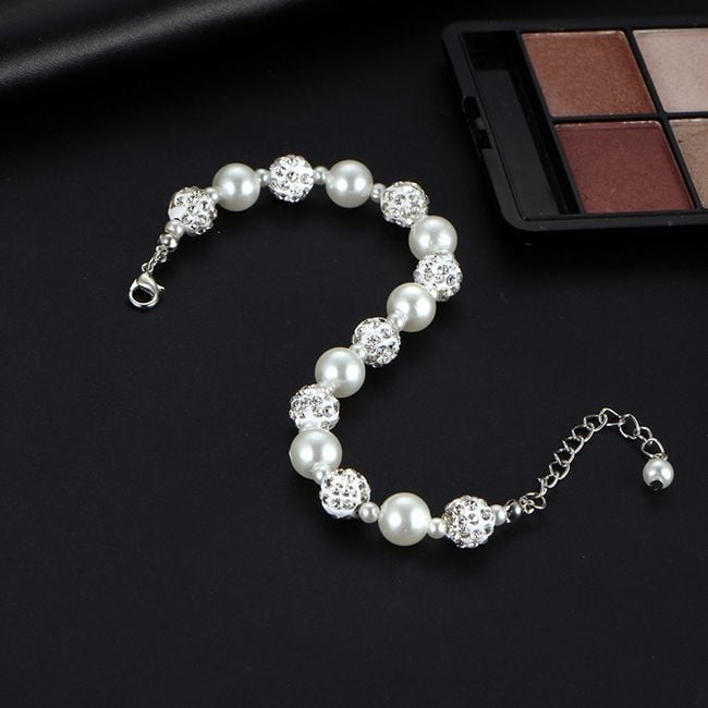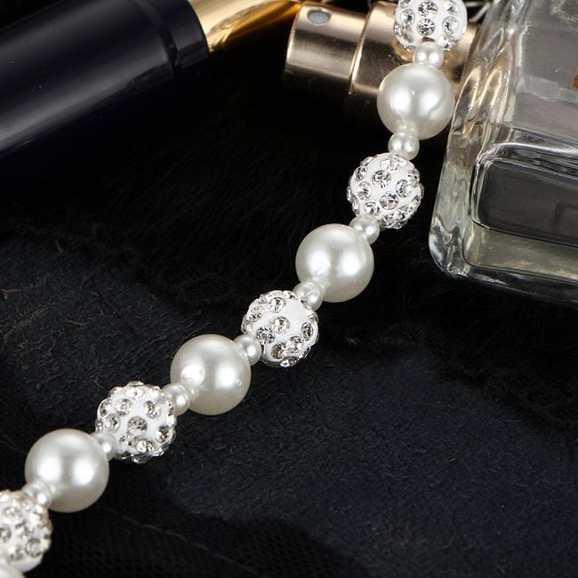 Das Armband ist weiß-silbern, besteht aus matten und glitzernden Perlen und ist für den täglichen Gebrauch geeignet.